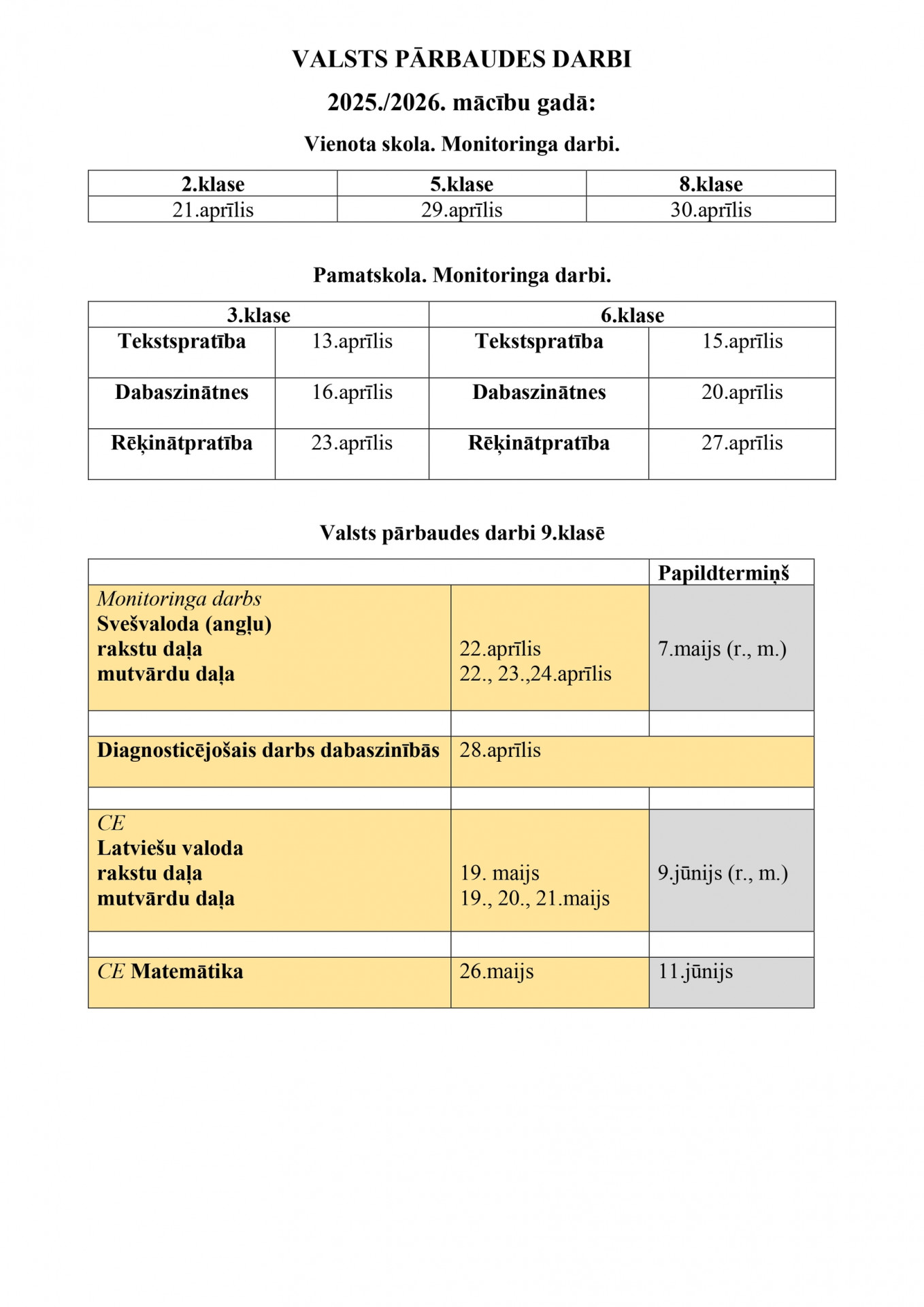 9. klases izglītojamiem no 2026. gada 5. janvāra līdz 2026. gada 12. jūnijam